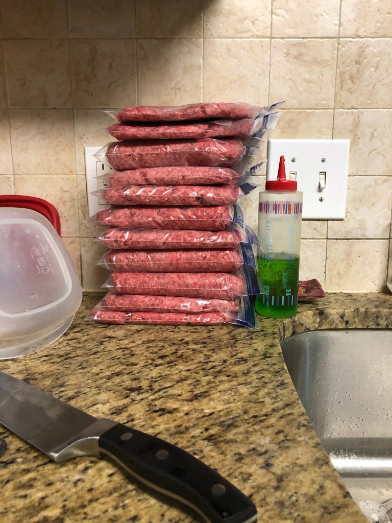 I like freezing in bags like this. Spreading them out makes the meat easier to thaw and fit in the freezer. I also write the date it was frozen on the outside and how many lbs it is. I like to split it into 1 or 2 lb bags.
